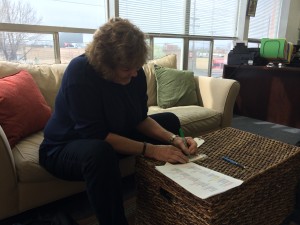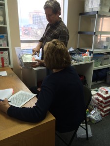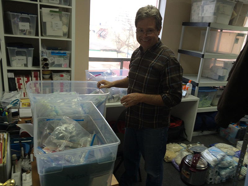 After writing out name tags for each of the seven duffel bags soon to be filled with supplies and distributed to volunteers on the first Nepal clinic, Laurie and Peter handed everything over to Country Coordinator Will Mateo for the important job of bag-cramming.