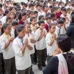 I wake daily to the sonorous sound of monks chanting, take walks to circle the grand and serene Boudha stupa, and am touched by the solemn eyes of a child sharing the traditional Namaste greeting.GDR 2014_10 Nepal Sch_SMD 02 The daily walk to clinic passes women in vivid saris, fruit vendors selling from overloaded bicycles, sacred cows, and temples draped in golden marigolds. Life feels vibrant, heightened and rich.